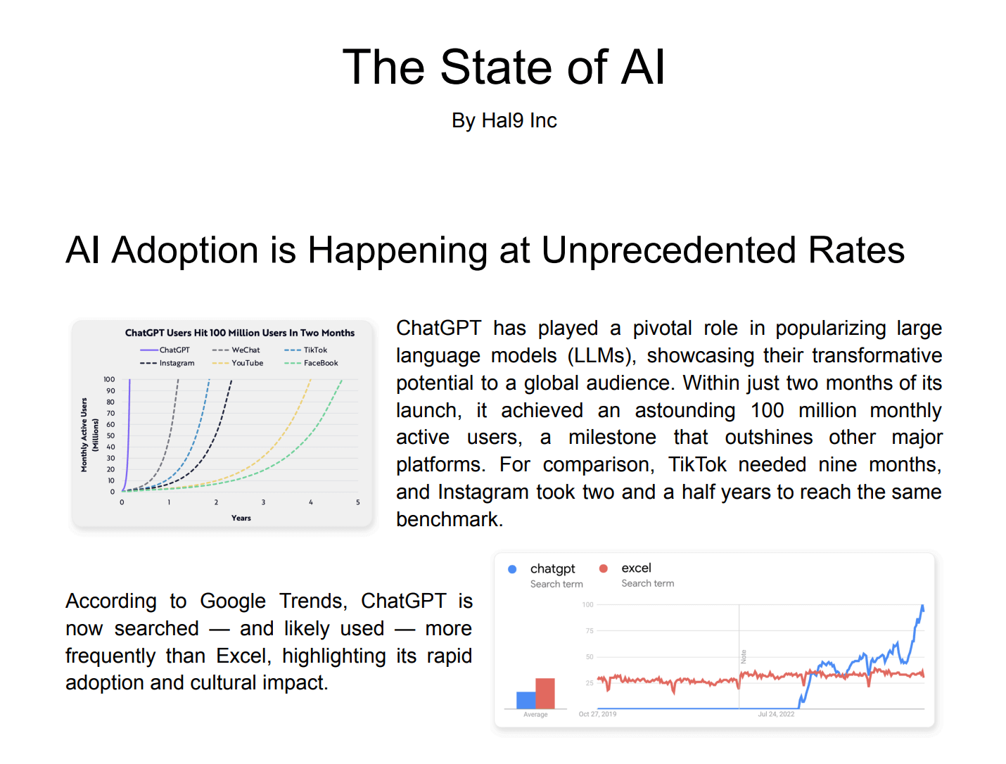 Explore the transformative power of AI with Hal9 Inc.'s "The State of AI" report, revealing how ChatGPT outpaces TikTok in adoption, generative AI boosts productivity by up to 43%, and costs plummet 10x yearly. Uncover trends toward Artificial General Intelligence, common project pitfalls, and actionable strategies for 90% accuracy in tasks like data analytics. Download now to seize AI’s potential and stay ahead.